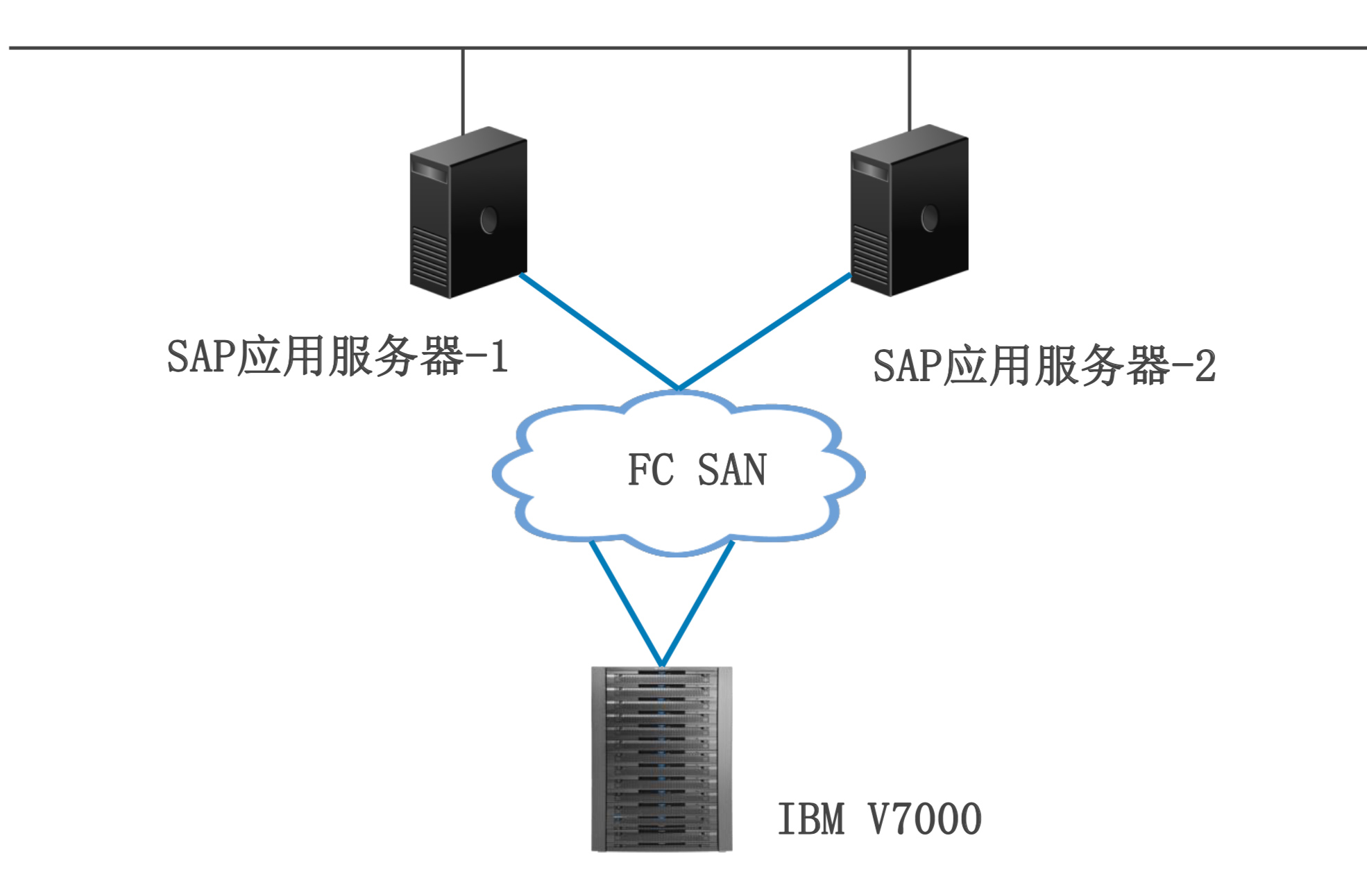 • 兩臺(tái)IBM 小型機(jī)通過SAN交換,F(xiàn)C鏈路連接到IBM V7000;
