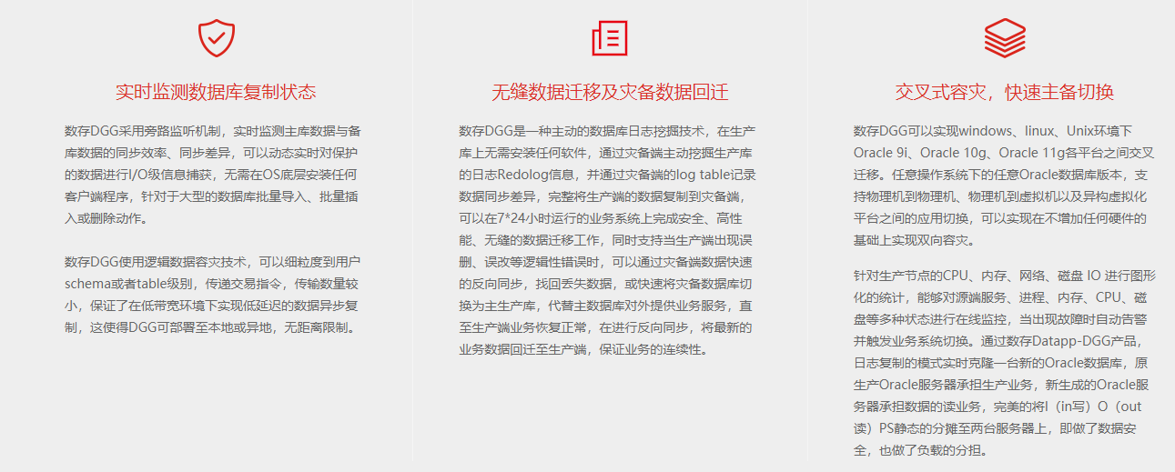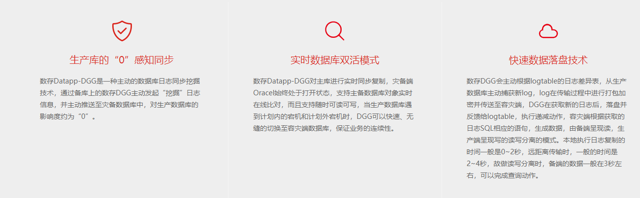 數(shù)存DGG產(chǎn)品是一款專門為數(shù)據(jù)庫提供實時容災(zāi)以及雙活高可用的產(chǎn)品解決方案。DGG基于Oralce日志挖掘技術(shù)對數(shù)據(jù)進(jìn)行實時復(fù)制,與主庫組成雙活的高可用模式,并具備讀寫分離的性能優(yōu)化技術(shù),保證數(shù)據(jù)庫可以7*24小時正常運轉(zhuǎn),滿足大型企業(yè)機(jī)構(gòu)對核心數(shù)據(jù)庫連續(xù)可用的要求。